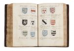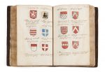 l’encadrement central, grand fleuron central au centre des plats. 285 ff (mal chiffrés 281), précédés de 2 ff. blancs, écriture cursive, avec de très nombreux blasons peints aquarellés, jusque six par page, chaque blason accompagné d’un texte descriptif de blasonnement, certaines armoiries laissées en blanc (blasonnement sans le dessin des armoiries) ; en fin de manuscrit on trouve inséré deux feuillets tapuscrits contenant une table sur papier de couleur rose. En français, manuscrit sur papier avec dessins de blasons aquarellés. Bel armorial du XVIe siècle réalisé peu de temps après la mort de Charles Quint. Il est précédé d’un traité du blason. TEXTE ff. 1-19, Traité du blason, illustré de blason aquarellés incipit, « A la louenge et a la reverence de Dieu et de sa glorieuse et tresbenoiste Vierge mere et des benoistz sainctz et sainctes… » ; ff. 19-20v, feuillets blancs ; ff. 21-279, Armorial, commençant par : « Les armes de nostre saint Père pape… » [sont représentées les armes de l’un des papes issus de la famille Médicis au XVIe siècle ; il peut s’agir de Léon X (1513-1521) ; Clément VII (1523-1534) ; Pie IV (1559-1565)] ; si l’on retient une date de la seconde moitié du XVIe siècle pour le présent Armorial, il doit s’agir du pape Pie IV ; on notera que dans la section réservée au comté de Hainault on trouve figurés les armories suivantes, datables : « Le roy Charles de Castille aussi conte de Haynaut escartelé le premier cartier escartelé de double escartelures le premier de Castille et de Leon, la seconde d’Arragon et de Sicile. Le second quartier escartelé des armes…comme son feu père les portoit depuis fust l’empereur et porta de l’Empire a l’escuchon comme voyez icy » (fol. 49). Il s’agit de Charles Quint (1500-1558), empereur du Saint-Empire à partir de 1520, jusque 1556 date de son abdication en faveur de son frère Ferdinand Ier. Ceci permettrait d’avancer une date postquem de 1520 et sans doute antequem de 1556 pour le présent armorial ; aux ff. 269-271v, une note indique : « Les pays dont possedoit le feu duc Charles de Bourgogne a l’heur de son trepas… » : cela confirme donc une date après 1558 pour une partie de cet Armorial dans tous les cas. Provenance : François Jousselin (étiquette ex-libris contrecollée sur le contreplat supérieur). Reliure accidentée, mors supérieur fendu, coiffe supérieure abîmée, restaurations anciennes, dorures passées, large mouillure claire.