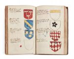 [MANUSCRIT.– NORMANDIE] Armorial normand. France, certainement Normandie, seconde moitié du XVIe s. 20,5 x 13 cm, veau blond glacé de la fin du XVIIe s., dos long, lettrage doré : « Armaries T.L. MS », double filet doré en encadrement sur les...