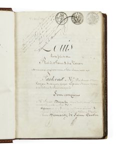 de M. le Marq. De Torcy », large décor doré en encadrement sur les plats composé d’une roulette à la grecque et d’une roulette à palmettes et fleurons, roulette intérieure dorée, doublures et gardes de papier vert. 170 ff., parchemin estampillé et timbré (Seine-Inférieure), écriture cursive à l’encre brune. En français, manuscrit sur parchemin. Document notarié de partage, joliment relié, relatifs à des familles de Seine-Maritime et de l’Eure. Les notaires rouennais qui signent cette copie faite pour la Veuve Dumoucel de Torcy sont Demachy & Lefebvre. Marie Louise Desmarets de Saint-Aubin (1759-1844) avait épousé en 1777 à Rouen en premières noces Charles-Marie-Alexandre Dumoucel, président à mortier au Parlement de Rouen : en 1781 elle hérite, à la mort du Marquis Dumoucel de Torcy, d’un hôtel rouennais et du château d’Igoville (Eure). Veuve, elle épouse en 1790 en secondes noces Jean Pierre Firmin Devieux (1755-1828), ancien capitaine de dragons au régiment du Dauphin. Il fuit la Révolution avant de commander la Garde nationale de Rouen en 1814. Il divorça en 1794 pour des raisons de gestion de patrimoine avant de l’épouser à nouveau, quelques années plus tard. Ce couple faisait partie, sous l’Empire, des trente plus grandes fortunes de Seine-Inférieure. Autre personne concernée par ce partage, Antoinette-Françoise-Sidonie Choiseul-Gouffier, veuve en premières noces du marquis de Torcy (Alexandre-Marie-Louis Dumoucel de Torcy (1778-1818)) et épouse en secondes noces de M. Edouard, duc de Fitz-James. Quelques frottements (plus particulièrement mors et coiffes), coins émoussés.