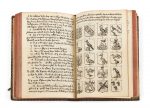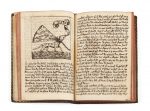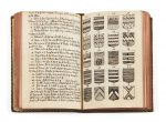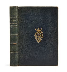 janséniste, maroquin vert, dos à 5 nerfs avec lettrage doré, simple filet à froid en encadrement sur les plats, armoiries dorées frappées sur le plat supérieur (non identifiées), roulette intérieure, gardes de papier marbré peigné, tranches rouges. 155 ff., précédés de 2 feuillets de garde et suivis d’un feuillet de garde, complet, écriture cursive à l’encre brune, nombreux dessins in-texte ou placés en regard, copiés sur les gravures de l’édition de Vulson de la Colombière (édition Paris, 1644, voir infra). En français, manuscrit sur papier orné de dessins à la plume. Manuscrit copié de la même main que Clermont-Ferrand, BM, MS 267, « La fortification, le théâtre du monde ou le petit atlas » par le Père Cassian Boisseret de Sauxillanges. Ce manuscrit est donné comme étant du XVIIIe siècle dans le CCFr. Sauxillanges est en région Auvergne, département du Puy-de-Dôme. Sorte de « copie figurée » de format réduit de la célèbre édition de Vulson de la Colombière, La science héroïque, traitant de la Noblesse, et de l’Origine des armes, de leurs blasons, et symboles, des tymbres, bourlets, couronnes, cimiers, lambrequins, supports, et tenans, et autre ornements…, A Paris, chez Sebastien Cramoisy et Gabriel Cramoisy, 1644 (édition originale). La présente copie ne suit pas trait pour trait cette édition mais notons que le premier texte au verso de la page de titre de l’édition de 1644 : « Explication de la première taille-douce servant de frontispice à ce livre » est bien copié dans notre manuscrit. Certaines pièces ont été écartées par contre. L’advertissement que l’on trouve dans l’édition est amputée de la fin dans le manuscrit (p. 9). Les figures – dessinées dans le manuscrit et d’une grande finesse – sont adaptées au petit format in-8 du présent manuscrit, parfois modifiées et une comparaison attentive de l’édition de 1644 et du présent manuscrit feront ressortir ces différences et adaptations. Vulson de la Colombière (mort en 1658) proposait dans son ouvrage – grand classique parmi les traités d’héraldique – à la fois un traité d’héraldique et un dictionnaire classé par meubles et figures, avec des planches d’une grande finesse d’exécution (seconde édition, Paris, Sebastien Mabre-Cramoisy, 1669, in-folio). Texte de Vulson de la Colombière (ff. 5-149v) précédé de textes liminaires : « Abrégé du blason en vers » ; « Epitaphe de M. de G. » ; « Sur la supression des eleux » ; « Abregé du blason » (ff. 1v-4v) ; titre (f. 5) ; portrait du roi Louis XIII (f. 6) ; titre-frontispice (f. 7). En fin de manuscrit on trouve des vers intitulés : « Madrigal sur le feu d’artifice fait pour la paix par ceux de la Religion p[rotestante] de Nismes » (ff. 151-154v). Provenance : Armes du XIXe s. (non identifiées). Coins émoussés, dos passé et un peu frotté, coupes frottées, sinon bel état.