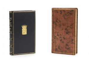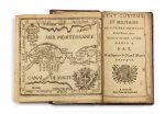pièce de titre en maroquin rouge, tête dorée, couvertures de papier à la colle du XVIIIe s. conservées. 72 p. ÉTAT MILITAIRE ILLUSTRE D’UNE CARTE DEPLIANTE DE LA MEDITERRANEE GRAVEE SUR CUIVRE. Rare ouvrage, important pour l’histoire de l’ordre et l’histoire de Malte au XVIIIe siècle. Cette édition est dédiée au grand maître Ramon Despuig. JOINT Almanach du département de l’Oise, année bissextile 1792, et IIIe de la liberté. Beauvais, Desjardins [1791 ?]. In-12 (13 x 7,2 cm), maroquin bleu nuit, double filet doré en encadrement avec armes dorées au centre des plats, dos à nerfs orné, tranches dorées, dentelle intérieure dorée, couvertures (Lobstein).152 p. L’almanach contient un tableau dépliant. Bel exemplaire, dans un maroquin parfaitement établi par Lobstein pour le comte de Ribes. Provenance : 1. - Tarlier (?) (ex-libris manuscrit). - P. J. A. Morange (ex-libris gravé). 2. Comte de Ribes (armes et ex-libris armorié, vente, Paris, Libert, 2005, n° 235). Bibliographie : 2. Saffroy, Almanachs, n° 298. 1. Trace d’ex-libris retiré au premier contreplat, gardes anciennes conservées, des rousseurs. 2. Exemplaire lavé et court de marges, petites taches en tête des ff. en début de l’ouvrage.