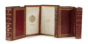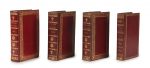 dorés avec fleurs de lys aux intersections, dos lisse orné de motifs dorés, petit encadrement intérieur doré, doublures et gardes de soie moirée écrue, tranches dorées (Relié F. Piton), chemise et étui modernes. [2] ff., p. xi à xvi, 629 p., [1] f. Exemplaire établi par le relieur strasbourgeois Frédéric Piton et de prestigieuse provenance : la Duchesse de Berry puis le major Abbey, puis Mortimer L. Schiff et enfin Olivier Le Bas. - Annuaire de l’état militaire de France pour l’année 1829. Paris, F. G. Levrault, 1829. In-12 (17,4 x 10,4 cm), maroquin à long grain grenat, sur les plats encadrement de motifs dorés avec fleurs de lys aux intersections, dos lisse orné de motifs dorés, tranches dorées (reliure de l’époque). xv, 680 p., [2] ff. Bien que la reliure ne soit pas signée, elle est ornée des mêmes fers (pour la plupart) que la précédente, sortie des ateliers de Frédéric Piton. - Annuaire de l’état militaire de France pour l’année 1830. Paris, Strasbourg, F. G. Levrault, 1830. In-12 (17,5 x 10,6 cm), maroquin à long grain grenat, sur les plats encadrement de motifs dorés avec fleurs de lys aux intersections, dos lisse orné de motifs dorés, tranches dorées (reliure de l’époque). vii, 648 p., [1] f. Bien que la reliure ne soit pas signée, elle est ornée des mêmes fers (pour la plupart) que la première, sorties des ateliers de Frédéric Piton. - État militaire du corps de l’artillerie de France. Paris, Starsbourg, F. G. Levrault, 1835. In-12 (17 x 10,2 cm), maroquin à long grain rouge, sur les plats encadrement de motifs dorés, dos lisse orné de motifs dorés, tranches dorées (reliure de l’époque). lx, 299 p. On a inséré 2 ff. d’errata entre les p. 296 et 297. Provenance : 1. - Duchesse de Berry (ex-libris de la bibliothèque du château de Rosny). - Major John Roland Abbey (ex-libris). - Mortimer L. Schiff (ex-libris). - Olivier Le Bas (ex-libris). 2 et 3. Olivier Le Bas (ex-libris). 1. Reliure un peu frottée, plus particulièrement les mors et les coiffes, dos de la chemise passé, étui un peu frotté. Infimes rousseurs. Les p. v à x manquent. 2. Reliure très légèrement frottée, rousseurs, mouillures claires en tête. 3. Reliure frottée, notamment coins, mors et coiffes. Quelques légères rousseurs. 4. Reliure légèrement frottée, infimes rousseurs. 3 ff. légèrement déréglés.