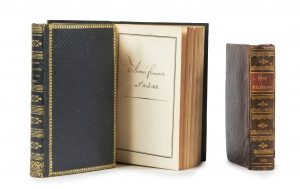 de l’armée française en 1830, à la fin du règne de Charles X. Ouvrage imprimé complété à la main. La page de titre est manuscrite : « L’Armée française au 1er mai 1830 ». JOINTS - Situation de l’armée au 1er avril 1826. [1826]. In-12 (15,4 x 9,8 cm), maroquin bleu-vert à grain long, frise dorée encadrant les plats, dos lisse orné de motifs dorés (reliure de l’époque). [1] f., 273 p., [15] ff. Inventaire des troupes de l’armée française en 1826. Ouvrage imprimé complété à la main. La page de titre est manuscrite : « L’Armée française au 1er avril 1826 ». - État militaire du corps royal de l’artillerie de France. Paris, Didot jeune, 1815. In-12 (13,1 x 7,8 cm), demi-basane, dos lisse orné de motifs doré, pièce de titre cerise (reliure de l’époque). [1] f., 527 p. Quelques annotations manuscrites à l’encre de main ancienne. Provenance : 1-3. Olivier Le Bas (ex-libris armorié). 2. Famille De Lormeau (ex-libris armorié). 1. Petits frottements aux coins, coiffes et au plat inférieur, un mors fragilisé en pied du dos, petites brunissures au 1er feuillet. 2. Petits frottements à la reliure, plus prononcés au dos, quelques cahiers brunis. 3. Reliure frottée, dos défraîchi, charnières frottées, restaurations aux mors, travaux de ver en pied du dos, rousseurs et petites taches, petit manque angulaire en pied de la page de titre.