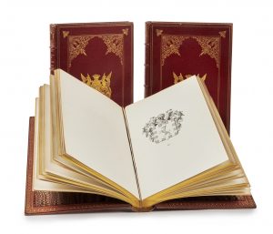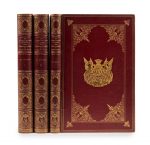 internes avec monogramme, armes dorées au centre des plats, dos à nerfs orné de motifs dorés avec monogramme dans le caisson de pied, tranches dorées, certaines couvertures conservées (Capé). Frontispice (armes de l’auteur), [2] ff., 57 p. pour chacun des tirages. Exceptionnel exemplaire de l’auteur. Le premier volume contient le texte en trois tirages différents (papier vélin, papier vergé et papier rose), les deuxième et troisième volumes renferment les 205 planches, composées chacune d’un blason ornementé vide, imprimé en lithographie, et très finement complété à l’encre par l’auteur. L’ENSEMBLE EST DONC ORNE DE 205 ARMOIRIES DESSINEES A LA MAIN PAR GEOFFROY DE MONTGRAND. L’exemplaire est complété par le portrait photographique de l’auteur en tirage albuminé. Provenance : Godefroy de Mongrand (armes et ex-libris). Quelques légers frottements aux coiffes et aux mors. Infimes rousseurs.