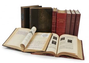 demi-chagrin noir à coins, double filet à froid encadrant les coins et les plats, dos lisse orné d’un cadre doré, couvertures et dos conservés (reliure de l’époque). XVI p., 235 p. Édition originale. ILLUSTREE DE 212 REPRODUCTIONS D’EX-LIBRIS. Tirage limité à 750 exemplaires numérotés, celui-ci un des 700 sur papier satiné des papeteries du Pont-de-Claix, celui-ci le n° 51, l’exemplaire du docteur Olivier (justification manuscrite au f. de justification), l’un des deux auteurs. L’exemplaire est interfolié avec d’importants ajouts, en particulier de nombreuses nouvelles notices, avec parfois des copies d’armes ou ex-libris. On a ajouté in-fine 2 ff. où l’on a contrecollé des comptes rendus de l’ouvrage dans la presses spécialisée. Notre exemplaire comporte également une correspondance volante avec des héraldistes au sujet de cet ouvrage, certains suggérant des ajouts et errata. JOINTS - GRAND-CARTERET (John). Les Almanachs français. Bibliographie-iconographie […]. Paris, J. Alisié & Cie, 1896. 1 fort volume in-8 (25,4 x 18,2 cm), demi-chagrin cerise, dos à nerfs, tête dorée. CX p., [1] f., 846 p., [1] f. Édition originale de cette bibliographie décrivant 3633 almanachs. ILLUSTREE DE 5 PLANCHES COLORIEES ET DE 306 VIGNETTES. Un des exemplaires sur beau papier vélin collé (n° 302). - QUENTIN-BAUCHART (Ernest). Les Femmes bibliophiles. Paris, Damascène Morgand, 1886. 2 volumes grand in-8 (28,6 x 18,4 cm), bradel de demi-maroquin anthracite à coins, dos lisse avec pièce de titre en maroquin bleu nuit, couvertures et dos conservés (reliure de l’époque). [3] ff., 466 p., [1] f.– [2] ff., 476 p., 1 f. bl. Édition originale. Tirage limité à 350 exemplaires numérotés, celui-ci un des 300 sur vélin de Hollande (n° 80). - GUIGARD (Jean). Nouvel armorial du bibliophile. Guide de l’amateur des livres armoriés. Paris, Émile Rondeau, 1890. 2 volumes grand in-8 (26,5 x 16,4 cm), demi-maroquin rouge à coins, dos à nerfs, tête dorée (V. Champs). [2] ff., XVII p., 390 p., [1] f.– [2] ff., 494 p., [2] ff. Édition originale. Important armorial général rassemblant les maisons souveraines, les femmes bibliophiles, les ecclésiastiques et les amateurs particuliers, avec de nombreuses reproductions de plats et fers de reliures. - ARNAUD (Étienne). Répertoire de généalogies françaises imprimées. [Paris ?], Berger-Levrault, 1978. 3 volumes in-8 (25,5 x 17,5 cm), bradel de toile bordeaux de l’éditeur, dos lisse. 598 p., [1] f.– 552 p., [2] ff. – 591 p. Provenance : 1. Docteur Eugène Olivier (ex-libris gravé). 1. Dos passé, avec des frottements. 2. Dos éclairci avec petits frottements, bande de décoloration en tête du premier plat. 3. Reliures frottées, en particulier les dos, petites taches sur les plats et les dos, coins émoussés, petites rousseurs éparses. 4. Dos passés, des frottements aux dos et coins. 5. Quelques traces sur les plats.
