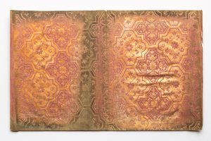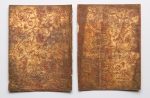 à motif floral et de fruits, avec entrelacs, sur fond rouge. Non identifié, Allemagne, Italie ?, fin XVIIIe s. - 2 fragments (26,5 x 19,5 cm) de papier doré gaufré à motif floral sur fond rouge. Signature « Matheus Merktl Aug. Vin ». Allemagne, fin XVIIIe s. - 2 fragments (26,5 x 20 cm) de papier doré gaufré à motif floral et de fruits, avec entrelacs, sur fond rouge. Non identifié, Allemagne, Italie ?, fin XVIIIe s. - fragment (25,5 x 18,5 cm) de papier doré gaufré à motif floral sur fond rouge. Non identifié, Allemagne, Italie ?, fin XVIIIe s. - fragment (24,5 x 39,5 cm) de papier doré gaufré à motif floral dans des compartiments géométriques. Non identifié, Allemagne, Italie ?, fin XVIIIe s. - fragment (26,5 x 20 cm) de papier doré gaufré à motif floral et de fruits sur fond vert. Signature « Michael », probablement Schwibecher, Allemagne, début XVIIIe s. - 2 fragments (26,5 x 19,5 cm) de papier doré gaufré à motif floral et de vénerie sur fond vert. Signature « Augsburg Ham[burg] Michael Schwibecher », Allemagne, début XVIIIe s. - fragment (16 x 20,5 cm) de papier doré à motif floral sur fond pourpre. Non identifié, France ?, début XIXe s. ? Traces de plis médians, bords effrangés, or parfois lacunaire, mouillures claire verdâtre sur un bord. Déchirure dans le motif à une feuille.