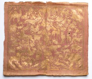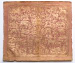 naturel brossé ocre-rose. Sans signature, probablement Allemagne, XVIIIe s. Absent de Kopylov, Allemagne, mais dans le goût des planches de Johann Lechner ou Carl Munck. - 2 feuilles entières (37 x 43 cm) et un fragment (24 x 43 cm), motif d’animaux variés doré sur papier naturel brossé ocre-rose et papier naturel orange (fragment). Signature « Johann Lechner in Fuerth n° 9 », Allemagne, XVIIIe s. Absent de Kopylov, Allemagne. - feuille entière (35 x 42 cm), motif sur 6 lignes de scènes champêtres et militaires, doré sur papier naturel brossé orange. Sans signature, Allemagne, fin du XVIIIe s. Motif conforme à Kopylov, Allemagne, n° 149 qui indique que Heijbroek, Sierpapier, n° 32, donne la feuille signée « Johann Lechner in Fuerth n° 295 ». Bibliographie : Christiane F. Kopylov, Papiers dorés d’Allemagne au siècle des lumières, Éditions des Cendres, 2012. Traces de plis médians, quelques bords un peu effrangés, petits manques à une feuille