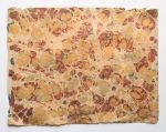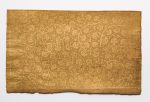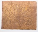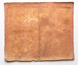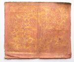 Signature « Andreas Reymund, N° 5 ». Allemagne (Nuremberg), milieu du XVIIIe s. - 3 feuilles entières (32,5 x 43 cm, 35,5 x 43 cm et 35,5 x 43,5 cm) de motifs de putti sur fond de rinceaux, dorés, imprimés sur un papier marbré caillouté pour la première, sur un fond de papier dominoté à motif floral, colorié au patron pour la seconde et sur un fond rose-mauve brossé pour la dernière. Non identifié, Italie ? début XIXe s. ? - fragment de feuille (35,5 x 21,5 cm) de papier doré à motif végétal imprimé sur fond brossé vert. Non identifié, début XIXe s. ? Traces de plis médians, bords effrangés, or parfois lacunaire, petites mouillures marginales (surtout visibles au verso, parfois plus prononcées).