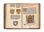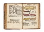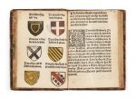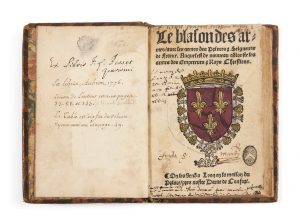 siècle). [16] ff. (signatures : A-C8). Rare édition lyonnaise du Blason des armes. ILLUSTREE DE 76 BLASONS GRAVES SUR BOIS, REHAUSSES ANCIENNEMENT A L’AQUARELLE. Impression en caractères gothiques. Relié à la suite : [SICILE (Jean Courtois de Mons, dit héraut)]. Le Blason des couleurs en armes, livrées et devises… Lyon, Olivier Arnoullet, [1536]. [4] ff., 46 ff. (signatures : A-G8). Rare édition lyonnaise de ce Blason des couleurs. ILLUSTREE DE NOMBREUSES PETITES FIGURES GRAVEES SUR BOIS REHAUSSEES ANCIENNEMENT A L’AQUARELLE. Un seul exemplaire est localisé en collection publique (Havard, Houghton Library). Un feuillet de table alphabétique manuscrite a été ajouté in-fine par un certain Aubron, lecteur du XVIIIe siècle. Notes manuscrites anciennes de plusieurs mains. Un lecteur mentionne la famille de Changy, originaire du Lyonnais et du Forez. Provenance : - Frère Etienne Marti (ex-libris manuscrit). - Ex-libris daté 1654 (manuscrit). - J.F. Josset (ex-libris manuscrit). - Aubron, 1776. - Cachet ex-libris armorié non identifié. Bibliographie : Bechtel, B-205 et B-221, Saffroy, I, 2028 et 2011. Des frottements à la reliure, coins émoussés, 8 ff. en déficit à la fin du premier ouvrage (le cahier C est manquant), exemplaire court de tête, large manque angulaire au f. B7 anciennement comblé. 6 ff. en déficit au 2e ouvrage (manquent les ff. F7 et G4-8), défauts au dernier feuillet conservé avec travail de ver.