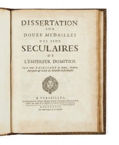 aux angles, dos à nerfs ornés de fleurs de lys dorées au centre des caissons, tranches dorées (reliure de l’époque). 67 p. Édition originale de cette « rare et très curieuse dissertation » (Auguste Aubry). ILLUSTREE DE 13 MEDAILLES GRAVEES SUR CUIVRE DANS LE TEXTE. L’ouvrage présente la série de médailles que l’empereur Domitien fit frapper à l’occasion de la sixième célébration des jeux séculaires en 88 ap. J.-C. Exemplaire conservé dans un maroquin aux armes de Louis XIV. Rainssant est nommé garde du cabinet des médailles de Louis XIV en 1684. Provenance : - Louis XIV (armes). - Charles Brissart-Binet (ex-libris). Bibliographie : Aubry, Bulletin du bouquiniste, t. XIII, n° 4729. OHR, pl. 2494, fer n° 10. Quelques éraflures et petites taches aux plats, nerfs et coins un peu frottés, coiffes frottées, mouillure affectant les gardes et les feuillets liminaires, dégras des remplis de la couvrure sur les tout premiers feuillets et sur les tout derniers feuillets, petite déchirure au bas d’un feuillet liminaire, feuillets brunis, rousseurs.
