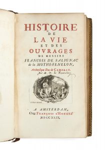 [RAMSAY (Andrew Michael)] Histoire de la vie et des ouvrages de Messire François de Salignac de la Mothe-Fenelon. Amsterdam, François L’Honoré, 1729. In-12 (16,6 x 9,4 cm), maroquin vert, armes dorées au centre des plats, dos à nerfs orné de...