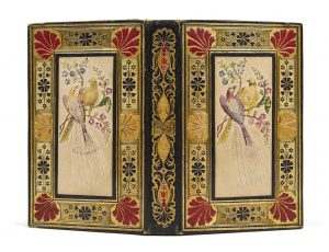 papier gaufré en couleurs représentant un couple d’oiseaux avec dessin en relief, dos lisse orné, tranches dorées, étui (reliure de l’époque). [3] ff., 250 p., [1] f. Anthologie de vers et proses en italien, précédée d’un calendrier. ILLUSTREE DU FRONTISPICE ET DE 6 PLANCHES GRAVEES SUR CUIVRE. Élégante reliure romantique à la plaque et décor gaufré. Provenance : - Madama Conelli, di Belgirate, 1853 (ex-libris manuscrit). - Tante Angelina (ex-libris manuscrit). Infimes rousseurs en début de volume, frottements aux coiffes, coins légèrement émoussés, décor central frotté, renforts anciens aux charnières.