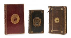à nerfs orné de motifs dorés (reliure de l’époque). [16] ff., 606 p., [5] ff. Exemplaire aux armes d’Emery-Toussaint Gardereau, écuyer, avocat au Parlement de Paris et contrôleur du grenier à sel de Blois. [ASSELIN (Abbé Gilles Thomas)]. La Religion. Paris, François-Guillaume L’Hermite, 1725. In-8 (19,7 x 12,4 cm), maroquin rouge, triple filet doré en encadrement des plats, armes dorées au centre, dos à nerfs orné de motifs dorés, tranches dorées (reliure de l’époque). [1] f., 151 p., [2] ff. Exemplaire en maroquin aux armes de Charles-François de Châteauneuf de Rochebonne, archevêque de Lyon. - Breviarium sanctae Lugdunensis ecclesiae primae galliarum sedis. Pars Verna. Lyon, Pierre Valfray, 1693. 1 (sur 4) vol. in-12 (15,3 x 9 cm), maroquin vert, triple filet doré en encadrement des plats avec fleurons d’angle dorés, armes dorées au centre, dos à nerfs orné de fleurons dorés, tranches dorées sur marbrure (reliure de l’époque). Frontispice, [20] ff., 854 p., cclxxviii p. Un tome seul (le Printemps - Verna) sur 4 (Verna - Æstiva - Autumnalis - Hiemalis). EXEMPLAIRE ORNE D’UN TITRE FRONTISPICE ET DE DEUX PLANCHES GRAVES SUR CUIVRE, conservé dans un maroquin aux armes de Charles-François de Châteauneuf de Rochebonne, archevêque de Lyon. Provenance : 1. Emery-Toussaint Gardereau (armes). 2. 3. Charles-François de Châteauneuf de Rochebonne (armes). 3. A. Grospellier (cachet). Bibliographie : 1. OHR, pl. 2274, fer n° 3. 2. OHR, pl. 2400, proche du fer n° 4. 3. OHR, pl. 2400, fer n° 5. 1. Reliure très usagée, traces de restauration, épidermures, armes frottées, surtout au second plat, mors supérieurs fendus avec manques, coins usés, infimes déchirures, larges mouillures claires, rousseurs et salissures. 2. Reliure restaurée, quelques frottements, mors supérieur fendu, quelques rousseurs. 3. Petites épidermures et manques au second plat affectant les armes, mors du premier plat fendu en pied, coins émoussés, accrocs à la coiffe inférieure, décharge du tampon au f. de titre, infimes déchirures sans manque aux deux derniers ff., rousseurs.