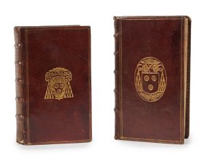 à nerfs orné, dentelle intérieure dorée, tranches dorées (reliure de l’époque). [2] ff., 573 p., [11] ff. Homélies sur les Évangiles des dimanches par l’abbé Monmorel. Tome 2 seul. Exemplaire en maroquin aux armes de Jacques-Bénigne Bossuet, évêque de Meaux. JOINT - MONMOREL, Homélies sur les évangiles des mystères de Notre Seigneur. [Paris, Denis Mariette , 1701 ?]. In-12 (16 x 9,7 cm), maroquin rouge, tripe filets dorés en encadrement avec armes dorées au centre des plats, dos à nerfs orné, dentelle intérieure dorée, tranches dorées (reliure de l’époque). [13] ff., 356 p., [8] ff. Tome 6 seul. Exemplaire en maroquin aux armes de Jacques-Bénigne Bossuet, évêque de Troyes, neveu du précédent. Provenance : 1. Jacques-Bénigne Bossuet, évêque de Meaux (armes). 2. Jacques-Bénigne Bossuet, évêque de Troyes (Cat., 1742, n° 1235 ?). - Fossé d’Arcosse, président de la juridiction consulaire de Soissons (ex-libris armorié). Bibliographie : OHR, pl. 2298, variante du fer 2 et pl. 2299, variante du fer 2 au format réduit. Reliures frottées, dos insolés. 1. Tome 2 seul. Tache d’humidité au premier plat, découpe d’ex-libris manuscrit au feuillet de titre, petite mouillure en marge des p. 15-50. 2. Tome 6 seul. Coiffe inférieure arasée, 2 mors fendus, tiers inférieur au feuillet de titre manquant.