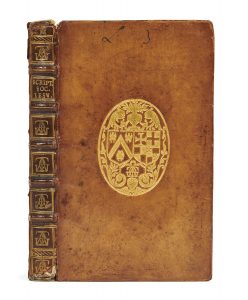 centre des caissons (reliure de l’époque). 287 p. Édition originale selon Sabin mais deuxième édition selon Sommervogel de ce premier répertoire bibliographique des auteurs ayant appartenus à la Compagnie de Jésus, rédigé par l’un d’entre eux, le Père Ribadeneira. Sommervogel évoque une première édition à la date de 1602 mais précise : « c’est le premier essai de Bibliothèque de nos écrivains, je ne l’ai jamais rencontré » ; avant de décrire plus précisément notre édition de 1608. Exemplaire aux armes et aux chiffres (IAG) de Jacques-Auguste de Thou et de sa seconde femme, Gasparde de La Chastre. Provenance : Jacques-Auguste de Thou et son épouse, Gasparde de La Chastre (armes et chiffres). Bibliographie : Sabin, 70778. Backer - Sommervogel, Bibliothèque de la Compagnie de Jésus, VI, 1754. OHR, pl. 216. Reliure un peu usagée avec petit manque de cuir en pied, dos usé avec mors fendus, coiffes absentes, coins émoussés, inscription manuscrite à l’encre au premier plat, feuillets brunis, rousseurs, bords des feuillets de fin froissés, étiquette de cote de bibliothèque contrecollée.