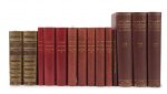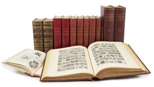 dont 2 s’entrelaçant au milieu de chaque côté, dos à nerfs orné de motifs dorés, monogramme doré en pied du dos, encadrement intérieur de multiples filets dorés, tranches dorées sur marbrure, couvertures conservées (Combe). 7 PLANCHES LITHOGRAPHIEES. JOINTS - RIESTSTAP (J. B.), ROLLAND (V.). Armoiries des familles contenues de l’armorial général de Rieststap. La Haye, Martinus Nijhoff, 1938. 6 parties en 3 vol. in-4 (31,3 x 23 cm), toile bordeaux de l’éditeur. Très abondante illustration. - Supplément à l’armorial général de J.-B. Rieststap. Paris, Imprimerie Paul Dupont, 1904. 8 vol. in-8 (24,6 x 16 cm), demi-chagrin maroquiné pourpre, plats de toile grège, dos lisses, premiers plats puis couvertures et dos conservés (reliure de l’éditeur). Abondante illustration. La série est complétée par un 9e volume : ROLLAND (Henri). Table du supplément à l’œuvre de J. B. Rieststap. Lyon, Société de sauvegarde historique, 1951. In-8, demi-chagrin aubergine, dos lisse, couvertures et dos conservés. 1.Dos un peu frottés et passés, accroc à une coiffe. 2. Cartonnages légèrement frottés, plus particulièrement les coins. 3. Le cuir des 5 derniers volumes est d’une couleur légèrement différente.