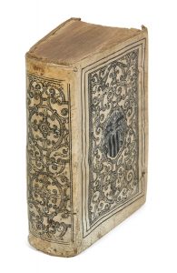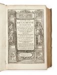 à recouvrements, large décor à entrelacs postérieur (XIXe s.) peint à l’encre noire sur les plats avec armes peintes au centre du premier plat (noir et argent), dos lisse orné du même décor (reliure du XVIIe s.). [33] ff., 1 f. bl., [2] ff., 728 p., [22] ff. Édition originale de cette diatribe anti-catholique. ILLUSTREE D’UN TITRE GRAVE ET D’UNE TABLE DEPLIANTE INTITULEE « TABLE ANALYTIQUE ET TYPIQUE REPRESENTANT LE CORPS DE CETTE RECHERCHE D’ANTECHRIST OU CHASSE DE LA BESTE ROMAINE ». L’ouvrage est dédié à Philippe Eschallart, de Fontenay-le-Comte. Ce livre de controverse religieuse a été publié en réponse au Catéchisme et abrégé des controverses… dressé à la demande du cardinal de Sourdis. Après condamnation du livre par un arrêt du parlement de Paris, George Thomson, théologien écossais qui en était l’auteur, forcé de quitter sa patrie pour ne pas se soumettre au gouvernement épiscopal établi par le roi Jacques, vint demander un asile à la France et fut placé comme pasteur en Vendée. Élégante reliure au décor postérieur. Provenance : - Augustiniens de Poitiers, 1658 (ex-libris manuscrit). - Armes non identifiées (XIXe s. ?). Bibliographie : Brunet, V, 1634-1635. USTC, 6803769. Petit manque au décor en pied du dos, des frottements, lacets manquants, petite découpe de papier en tête du 2e f., sans doute pour faire disparaître un ex-libris, mouillure en marge des ff. 3-6.