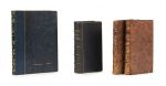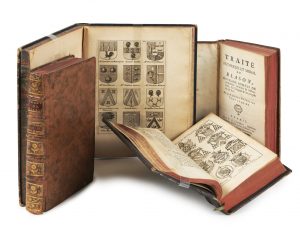 du XIXe siècle). [12] ff., 318 p., [13] ff. Édition originale, seule parue. ILLUSTREE DU FRONTISPICE GRAVE PAR LE PAUTRE ET DE 55 PLANCHES HORS-TEXTE GRAVEES AU BURIN. « Ouvrage rare recherché pour les blasons » (Saffroy). JOINTS - DUPUY DEMPORTES (Jean-Baptiste). Traité historique et moral du blason. Paris, C. A. Jombert, 1754. 2 volumes in-12 (17 x 9,2 cm), veau brun marbré, filet à froid encadrant les plats, dos à nerfs ornés de motifs dorés avec pièces de titre et de tomaison en maroquin rouge (reliure de l’époque). [2] ff., VIII p., 307 p., [2] ff. – [1] f., VI p., 374 p. Édition originale. Cet ouvrage présente des explications sur la signification symbolique des pièces et meubles du blason. - [LA FEUILLE (Daniel de)]. Methode nouvelle pour apprendre l’art du blason, ou la science des nobles par dialogues. Amsterdam, Daniel de La Feuille, 1695. Petit in-4 (19,8 x 14,2 cm), demi-maroquin bleu outremer, double filet doré bordant les plats, dos à nerfs orné de fleurs de lis répétées (reliure du XIXe siècle). [4] ff. (dont le frontispice), 120 p., [1] f. ÉDITION ILLUSTREE DU FRONTISPICE ET DE 50 PLANCHES GRAVEES AU BURIN, MONTEES SUR ONGLETS, SOIT 17 PLANCHES DE MODELES DE « SUPPORTS ET CIMIERS POUR LES ORNEMENS DES ARMES » ET 33 PLANCHES DE « PAVILLONS ET ENSEIGNES DE MER ». Certaines planches de blasons sont aquarellées. Texte sur 2 colonnes. Le petit Traité des Pavillons et enseignes que chaque Nation porte à la Mer est imprimé aux p. 111-120 en français et en néerlandais. Provenance : 1. Ex-libris manuscrit ancien. 2. Baron de Traversay (ex-libris armorié). 3. - Chiffre entrelacé couronné non identifié (tampon). - Olivier Le Bas (ex-libris armorié). Bibliographie : Saffroy, 2266, 2313 et 2272 (la description des planches ne correspond pas). 1. Frottements aux coins, dos déteinté avec petit travail de vers en pied, fortes rousseurs, petit manque de papier en tête du dernier f. sans perte de texte. 2. Reliures frottées et usées, pièce de tomaison du t. I manquante et manque de peau, dos du t. I décollé, premiers ff. du t. I partiellement déreliés. 3. Coins émoussés, manquent les pl. 1, 8, 12 de la série des modèles d’ornements (la pl. 11 est en double), déchirure en pied de la pl. 11 (2e exemplaire), nombreuses réfections angulaires aux planches, quelques planches brunies, quelques rousseurs.