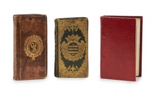 à la plaque, armes dorées au centre, dos lisse orné de motifs de fleurs de lys dorés (reliure de l’époque). Manuscrit de 41 p. à l’encre. Exemplaire en maroquin vert aux armes vraisemblablement de la famille Bouvard de Fourqueux. - AUSONE. D. Magni Ausonii Burdigalensis Opera. Amsterdam, Janson, 1621. In-16 (11,2 x 5,2 cm), basane brune, double filet doré en encadrement des plats, armes dorées au centre, dos lisse, auteur doré (reliure de l’époque). Frontispice, 237 p., [1] f., manque le f. aii. EXEMPLAIRE ORNE D’UN FRONTISPICE GRAVE SUR CUIVRE. Exemplaire aux armes de François-Victor Le Tonnelier de Breteuil, marquis de Fontenay-Trésigny, baron de Boitron. - Almanac de Gotha pour l’année 1795, Gotha, Carl-Wilhelm Ettinger. In-16 (10,2 x 5,8 cm), reliure janséniste maroquin à long grain rouge, dos lisse, titre et date dorés (reliure du XIXe s.). [1] ff., 1 frontispice, 1 tableau dépliant, 3 pl. de portraits, [28] ff. avec 12 pl. hors-texte intercalées, 88 p., 130 p., [14] ff. ÉDITION ORNEE D’UN FRONTISPICE, DE 3 PORTRAITS ET DE 12 PLANCHES, LE TOUT GRAVE SUR CUIVRE. Le plan de Washington manque à notre exemplaire, comme souvent. Provenance : 1. Famille Bouvard de Fourqueux. 2. - François-Victor Le Tonnelier de Breteuil, marquis de Fontenay-Trésigny, baron de Boitron (armes). - B. Gonod (ex-libris). 3. Ex-libris gaufré (blason non identifié). Bibliographie : 1. OHR, pl. 615, très proche du fer n° 1. 2. OHR, pl. 1478, très proche du fer n° 2. 3. Saffroy, Almanachs, n° 430. 1. Reliure usée, coins et mors frottés, dos plissé, rousseurs, inscription manuscrite au crayon de papier au verso du dernier f. 2. Reliure très défraîchie, plats salis, coins très usés, coiffes arasées, mouillure affectant les contre-plats et le bas des feuillets, mouillure affectant le haut des premiers ff., un f. blanc liminaire découpé, manque le f. aii, rousseurs, inscription manuscrite à l’encre au dernier f. blanc. 3. Mors et coiffes légèrement frottés, trace d’ex-libris décollé au premier contreplat, mouillure affectant les premiers feuillets et le frontispice, trace de deux tampons au f. de titre, rousseurs, certains feuillets salis, petites déchirures, manque le plan de Washington.