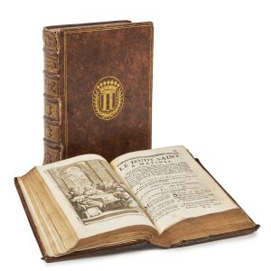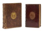 des plats, dos à nerfs orné aux petits fers avec chiffre ADHCDB doré (reliure de la 2e moitié du XVIIe siècle). 282 p., 1 f. bl.– 572 p. Nouvelle édition de cet important traité en italien sur les médailles, revue par Jean-Baptiste Du Val. ILLUSTREE DE NOMBREUSES REPRODUCTIONS DE MEDAILLES DANS LE TEXTE. L’ouvrage est dédié au Cardinal de Savoie. Notes manuscrites anciennes. Exemplaire aux armes d’Achille de Harlay (1639-1712) qui légua sa vaste collection à la bibliothèque des jésuites de Paris. JOINT L’Office de la Semaine sainte et de l’octave de Pasque… Paris, N. Pepie, 1716. Grand in-8 (19,4 x 12,4 cm), maroquin vieux-rouge, triple filets dorés en encadrement avec armes dorées au centre des plats, dos à nerfs orné, tranches dorées, dentelle intérieure dorée (reliure de l’époque). [4] ff., 662 p., [1] f. Édition de la Semaine Sainte en français et en latin. ILLUSTREE DU FRONTISPICE GRAVE SUR CUIVRE PAR BAZIN ET DE 5 FIGURES A PLEINE PAGE GRAVEES SUR CUIVRE. Exemplaire aux armes la duchesse de Berry, fille aînée du Régent. Provenance : 1. - Achille de Harlay, comte de Beaumont (armes et chiffre doré). - Jésuites de Paris (ex-libris manuscrit et imprimé). 2. - Marie-Louise-Élisabeth, duchesse de Berry (armes). - Marie-Marguerite Pointel, 1773 (ex-libris manuscrit). Bibliographie : Librairie Jammes, Cabinets de curiosité, collections, collectionneurs, n° 371. OHR, 744 et 2546, fer 4. 1. Reliure très frottée, mors fendus, charnières fragilisées, coiffes arasées avec travaux de vers en tête, importants manques de peau en tête et pied du dos, exemplaire court de marge en tête, des rousseurs. 2. Coins frottés et gauchis, quelques épidermures sur les plats, dos assombri, petite mouillure en tête des feuillets courant tout au long du volume, petites salissures affectant les premiers ff.