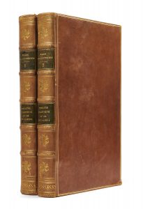 un maigre), dos à nerfs ornés, pièces de titre et de tomaison vert bouteille (reliure de la fin du XIXe s.). [13] ff. (dont le titre-frontispice et un portrait), 593 p., [6] ff.– [18] ff. (dont le portrait en double planche), 640 p. Édition originale de cet important ouvrage sur les tournois et les duels. ILLUSTREE D’UN TITRE-FRONTISPICE (T. I), DE 2 PORTRAITS GRAVES SUR CUIVRE PAR CHAUVEAU D’APRES NANTEUIL (DOUBLE AU T. II), DE 6 PLANCHES GRAVEES SUR CUIVRE (5 DOUBLES ET 1 DEPLIANTE), D’UNE GRANDE VIGNETTE SUR CUIVRE FIGURANT LES ARMES DE L’AUTEUR (T. II), AUXQUELS S’AJOUTENT DE NOMBREUX BANDEAUX ET CULS-DE-LAMPE GRAVES SUR BOIS. Une très belle planche montre le carrousel qui se tint sur la place Royale en 1621 à l’occasion des mariages de Louis XIII et de sa sœur. Notre exemplaire est bien complet de la figure représentant le combat d’un chien, souvent en déficit. Bibliographie : Brunet, V, 1389. Dos passés, coins frottés, quelques taches sur les plats, petites griffure au premier plat du t. I, des rousseurs, parfois plus prononcées, déchirure en pied de la planche dépliante représentant le carrousel (entre les ff. 360 et 361 au t. I) et petite déchirure de la pl. du combat d’un chien (t. II, f. 300-301), petites bandes de papier collées au f. portant les armes de l’auteur au début du t. II.