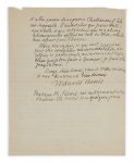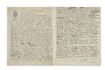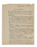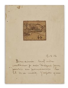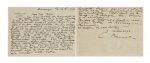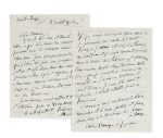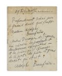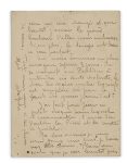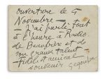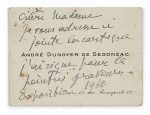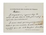 Saint-Germain, 1er octobre. 1 p. sur 1 f. in-4 (26,8 x 20,8 cm). - 1 manuscrit autographe de 5 lignes paginé « 25 » avec un f. de tapuscrit corrigé in-8 (22,4 x 16,4 cm) contrecollé sur une feuille. S. l. n. d. Ces deux documents montrent l’implication de Maurice Denis dans la célébration de la mémoire du peintre Paul Sérusier, sur lequel Denis est, à l’heure de la lettre, en train de rédiger un texte (peut-être celui qui sera ajouté par la suite à l’édition de L’ABC de la Peinture de Sérusier, Paris, 1942). Dans la lettre il se réjouit du début de reconnaissance dont jouit P. Sérusier : « On commence à rendre justice à Sérusier ». Le fragment manuscrit porte le jugement suivant : « et symbolistes. On regarde les symbolistes avec intérêt […], on achète les impressionnistes. J’ai eu des compliments de Mallarmé, Redon et Puvis et quelques notes dans les journaux, mais les bourgeois n’y voient rien du tout… » DUNOYER DE SEGONZAC (André) : - 1 carte-lettre autographe à Mme Adolphe Beaufrère. Paris, 19 février 1960. 1 p. sur 1 f. in-12 (16,4 x 12,6 cm). - 1 carte de visite autographe signée à Mme Adolphe Beaufrère. Paris, s. d. 2 p. sur 1 f. in-32 (6,2 x 8,6 cm). - 1 lettre autographe signée à Mme Jean Georges Cornélius. Saint-Tropez, 8 juillet 1963. 4 p. sur 2 ff. in-4 (27 x 21 cm). Ces lettres sont adressées à des épouses de peintres que Dunoyer de Segonzac a connus au cours de sa vie artistique. L’une d’elle est une lettre de condoléance à Mme Adolphe Beaufrère, dont l’époux décéda le 19 février 1960. BERNARD (Émile) : - 1 lettre autographe signée à son épouse et leurs enfants. Zumaya (Espagne), 16 août 1932. 4 p. sur 2 ff. in-8 oblong (16,2 x 22,3 cm). On y lit en particulier des réflexions sur son art : « Zulo est passionné pour son art ; mais selon moi il tient trop compte de certaines choses présentes et croit trop qu’il faut être moderne […] ». - 1 lettre autographe signée à son épouse. Madrid, 12 août 1932. 4 p. sur 2 ff. in-4 (27,4 x 21,4 cm). Dans ces deux intéressantes missives, Bernard décrit à son épouse son voyage en Espagne et la tentative, manquée, de putsch par le général José Sanjurjo Sacanell qui l’a surpris dans la capitale. Il évoque ensuite le peintre espagnol Ignacio Zuloaga (1870-1945) qui, selon lui, est à l’origine de la redécouverte de l’œuvre du Greco. BEAUFRÈRE (Adolphe) : - 1 carte-lettre autographe signée à son épouse, ornée d’un petit dessin à l’encre, à l’aquarelle et aux crayons de couleurs. S. l., 15 février 1916. 2 p. sur 1 f. in-12 (14 x 10,4 cm). Jolie lettre écrite à son épouse et leurs enfants par Beaufrère, alors mobilisé en pleine Grande Guerre. JOINT 1 carte-lettre à Mme Adolphe Beaufrère écrite par un directeur des Musées de France. Paris, s. d. 2 p. sur 1 f. in-12 oblong (10,6 x 14 cm). 1. Petite déchirure en tête de la lettre sans atteinte au texte, traces de pliure, papier jauni. 2. Feuillet manuscrit froissé avec traces de pliures. 3. Nombreuses rousseurs, traces de pliures affectant la carte-lettre. 4. Rousseurs et petites taches sur la carte. 5. Trace de pliure sur le f. manuscrit, rousseurs sur le f. dactylographié. 8. Quelques taches. 9. Plusieurs taches.