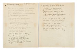 chanson y figure intitulée : « La complainte de celui qui a mal tourné », les premiers mots étant barrés au crayon. On voit également la date du 15 novembre 1956 en tête du premier feuillet. Dans le manuscrit, les vers sont regroupés en huitains, alors qu’ils seront en quatrains dans la version définitive. Enfin, quelques variantes figurent en début de chanson : « Faut dire qu’il y avait bien des temps » deviendra « Il y avait des temps et des temps » ou « Bien des temps cré nom d’un tonneau » qui disparaîtra, laissant la place au vers « ni de charbon dans mon fourneau » qui ne figure pas sur le manuscrit. Le reste du document est conforme à la version définitive. Traces de plis, quelques petites taches claires, encre un peu passée, marque d’agrafe.