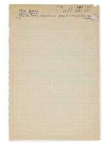 chanson est Jeanne Le Bonniec, épouse de Marcel Planche, qui recueillirent Georges Brassens à Paris à partir de 1942 et jusqu’en 1966. La chanson est un vibrant hommage à ce couple, et plus particulièrement à Jeanne, pour leur hospitalité désintéressée. Le manuscrit présente trois couplets barrées, et la plupart des couplets sont incomplets de la fin. Des vers sont notés en fin de page qui se retrouvent, dans la version définitive, à la suite des vers notés ici en deuxième couplet. Il s’agit probablement d’un essai d’ordonnancement des couplets et des vers. Seuls trois vers figurent ici qui n’ont pas été retenus dans la version définitive. Bords effrangés, papier un peu bruni en tête. Petit papier collé au verso, masquant 3 lettres.