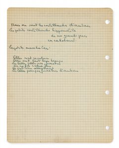t’amuser de toi / Qu’un galant se souvient de toi. / Chacun passe le pont du passé / À force de suivre son chemin / On a envie de repasser le pont du passé / On y trouve les dames du temps jadis […]. » Le verso quant à lui offre des recherches de vers et de strophes pour la chanson les Funérailles d’antan, gravée sur l’album du même nom, publié en 1960. « Les petits corbillards hippomobiles / de nos grands pères / en cahotant. / Les petits macchabées […]. » Bord de tête un peu effrangé, légères brunissures.