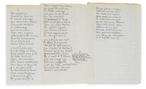 album édité en France, sorti en 1976. Hormis le doublement des dernières strophes de chaque couplet, qui ne figure pas ici, et un mot (« je pris plein d ‘émoi » pour « j’cueillis plein d’émois ») le texte est en tous points conforme à la version définitive. Au verso du dernier feuillet, on trouve les trois premières strophes pour la chanson Montélimar, publiée sur le même album. On y décèle quelques variations avec la version définitive, notamment une inversion de strophes, et l’absence du refrain. Feuillets très légèrement froissés ; ils ont été recoupés légèrement en tête et en gouttière et sont effrangés et un peu brunis en tête.