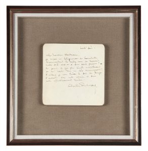 DEBUSSY (Claude) Lettre autographe signée à G. Hartmann. [Paris], lundi soir [septembre ou début octobre 1895]. In-12 (11,8 x 12 cm). 1 p. sur 1 f., sous verre, monté sur un support. Lettre autographe signée adressée à [Georges] Hartmann...