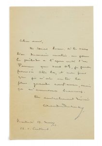 tu veux bien demain, ne jouer le “Prélude à l’après-midi d’un Faune”. Que vers 11h ; je pense pouvoir être là, et non pas que je n’aie en toi la plus grande confiance, mais ça m’amusera beaucoup. » Provenance: Pierre Boulez. Bibliographie: C. Debussy, Correspondance 1872-1918, Gallimard, 2005, Année 1903, n° 125, p. 798. Trace de pliure centrale, feuillet légèrement froissé