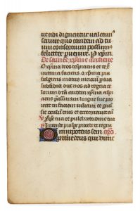 [MANUSCRIT] Feuillet de livre d’heures latin. [France, vers 1450]. 1 f. in-16 (8,7 x 5,7 cm) sur peau de vélin, 2 lettrines enluminées (bleu, magenta, or), texte en brun et rouge, 17 lignes par page, monté sous marie-jeanne et fenêtre. Feuillet...