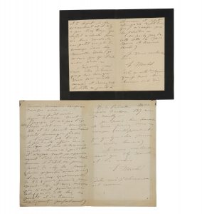 Dacheux) puisse « s’engager ». - 1 LAS, 22 mai 1885, 3 p. sur 1 bifeuillet in-12, (17,6 x 11,2 cm), papier de deuil. Elle s’inquiète de gens honorables dans le besoin, notamment une certaine Mme Maron qui a « rendu de grands services sous le Siège et même depuis ». Mme Mercier l’a prévenue de la détresse de cette femme. Clemenceau et Lafont la connaissent. Lafont a d’ailleurs « cherché pour ces bons vieillards un petit emploi de concierges dans les nouvelles écoles (je ne crois pas qu’il ait encore réussi). »