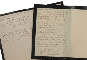 sachant Laguerre et Clemenceau absents de Paris, elle demande l’adresse du député Clovis Hugues (1851-1907) : « Sans travail, ayant deux petits enfants malades et sa femme condamnée à trois mois de prison (ce qui vous prouve qu’elle n’a pas fait grand chose), il ne lui reste plus que quelques jours, mais si elle les fait ses enfants (et peut-être son mari) n’existeront plus… » - 1 LAS à Barrois. 29 juillet 1885. 2 p. sur 1 bifeuillet in-8 (20,8 x 17,5 cm), papier de deuil. La lettre court sur son cousin Lucien Dacheux : Louise Michel demande s’il est possible lui faire obtenir une place de concierge dans l’entrepôt de vins où il travaille depuis quinze ans. C’est Paul Argyriadès, sympathisant guesdiste, qui est chargée de porter la lettre. » c’est seulement un changement d’occupation à cause de sa maladie » précise Louise Michel. À la première lettre, petite déchirure en pied, au niveau de la pliure.