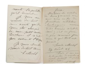 correspondants de bien vouloir « apostiller la lettre ci-jointe d’un Calédonien ». S’agit-il d’un ancien camarade du bagne ? Elle rappelle la petite affaire pendante de son cousin Dacheux. Jean Lafont est député de la Seine, inscrit au groupe de la Gauche radicale et ami de Clemenceau. JOINT 1 LAS du 24 août 1886, sans destinataire, mais sans doute adressée à Clemenceau. 1 p. sur 1 f. in-8 (20,6 x 13,2 cm). « Hier (sous les arcades du Louvre) on a crié en mon nom un tas de fumisteries intitulées “Boulangeries”. Aucune de ces âneries n’est de moi ; c’est un faux de plus commis par ceux à qui tout est permis. » La lettre comporte le post-scriptum suivant : « Prière à vos amis de la justice de vouloir bien insérer de suite la petite note ci-dessus ». C’est une allusion à une affaire du 9 mars 1883 où elle avait dirigé aux Invalides, avec Émile Pouget, une manifestation au nom des « sans-travail » qui avait dégénéré rapidement en pillages de trois boulangeries. Le début de la lettre du 24 août 1886 manque.