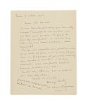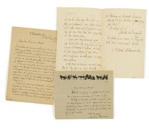 Arsène Alexandre et Claude Monet. Dans le cadre de la donation par Claude Monet de ses Nymphéas à l’État français, Arsène Alexandre prépare un ouvrage sur la genèse des Nymphéas, qui sera richement illustré. Ainsi, il demande à Claude Monet son autorisation afin que le photographe André Marty puisse venir à Giverny prendre quelques clichés : « Pour cela, l’opérateur André Marty vous demanderait l’autorisation de venir prendre les clichés nécessaires pour la décomposition, et comme ils disent, le triage des couleurs. » Dans une autre lettre, Arsène Alexandre souhaite introduire ses amis, Monsieur et Madame de Clermont-Tonnerre, désireux de découvrir « cette passionnante visite » qu’est la découverte de Giverny. JOINT LEROLLE (Henry). Lettre autographe signée du musicien, peintre et collectionneur Henry Lerolle à Claude Monet. Paris, 15 octobre 1920. 1 p. sur 1 f. in-12 (17,8 x 13,6 cm). Ayant appris que Monet avait pour projet de scinder en plusieurs parties ses Nymphéas, Henry Lerolle s’empresse de lui écrire pour lui demander si son épouse et lui peuvent venir admirer ses peintures : « Je vois dans les journaux que vous allez rompre l’ensemble de vos peintures que j’ai tant envie de voir. Et j’en ai le désir plus que jamais. » 1. Rousseurs, traces de pliure, certains feuillets brunis et petites déchirures sans atteinte au texte. 2. Trace de pliure.
