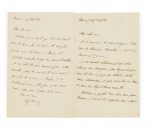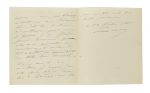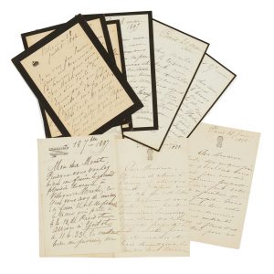 Lefèvre, épouse d’Ernest Lefèvre, neveu d’Auguste Vacquerie. Dans une lettre du 25 janvier 1888, Marie Ernest Lefèvre fait part à Claude Monet de son enchantement après l’exposition de ses œuvres chez Goupil : « nous en sommes revenus enchantés ravis et pleins d’admiration pour ces merveilles de lumière et de transparence » (lettre du 25 janvier 1888). Elle évoque ensuite les soins qu’elle apporte à Auguste Vacquerie : « Je suis ensuite revenue très vite à Paris, car Monsieur Vacquerie y était seul, et que ma présence auprès de lui constitue mon plus impérieux devoir » (lettre du 28 novembre). Le 2 juin, elle accepte l’invitation de Monet de passer quelques jours à Giverny : « Dites à votre femme quel plaisir j’aurai à la revoir et à faire plus ample connaissance avec elle. » JOINTS - HERVIEU (Paul). Réunion de 2 billets autographes signées à Claude Monet. Paris, 29 novembre 1887 et Paris, 26 novembre 1888. 2 p. et demi sur 2 f. in-12 (15,5 x 9,8 cm). Dans ces deux missives, il est question d’Octave Mirbeau. Paul Hervieu convie Claude Monet à se joindre à un dîner qu’il organise, aux côtés d’Octave Mirbeau (LAS du 29 novembre 1887). Dans la seconde, datée du 26 novembre 1888, Paul Hervieu communique à Monet l’adresse de Maurice Bouchor, avant de s’attarder quelques instants sur le prochain voyage de Mirbeau : « Mirbeau a quitté Paris hier soir pour Kerisper, d’où il doit repartir sans retard pour aller vous trouver. » - PIERSON (Blanche). Lettre autographe signée [à Octave Mirbeau]. S. l., 24 mai 1911. 2 p. et demi sur 1 double f. in-12 (15,1 x 13,7 cm). Ayant récemment appris la disparition d’Alice Monet, seconde épouse du peintre, elle se remémore avec émotion son séjour à Giverny cinq ans auparavant : « je n’ai pas oublié avec quelle affabilité, quelle bonne grâce souriante j’y ai été reçue par Monsieur et Madame Monet dont j’apprends la mort ! » Elle charge leur ami commun, Octave Mirbeau, de faire part à Claude Monet de sa profonde affliction et de ses tendres pensées : « Vous qui l’aimez autant que vous l’admirez, dites-lui la part bien sympathique que je prends à son affreuse perte ! » - BOURGEOIS (Léon). Lettre autographe signée à Claude Monet. Agay, 6 janvier [1905] 1 p. sur 1 f. in-12 (14,4 x 11,5 cm), adresse au dos. Léon Bourgeois remercie Monet pour l’envoi de ses photographies des vues de la Tamise. Il n’avait pu assister à l’exposition donnée par Monet au printemps dernier. Il réitère son admiration pour le peintre : « Mais j’ai suivi depuis trop d’années et avec trop de passion votre œuvre merveilleuse pour ne pas savoir la joie que va me donner, quand vers la fin du mois, je regagnerai Paris, la vue de cet album. » 1. Quelques rousseurs et petites taches d’encre, traces de pliures. 2. Traces de pliures, un feuillet déchiré sans atteinte au texte. 3. Trace de pliure. 4. Trace de pliure, infimes salissures au verso de la lettre.