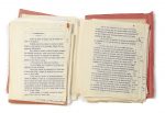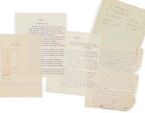 catalan, journal dirigé par Bausil, du 28 septembre 1929 leur projet de recueil « de nouvelles alternées ». Trenet y publie au début des années 1930 les « cartes postales » pour les villes de Narbonne, Le Havre, Montauban et Béziers. C’est à partir de la revue que V. Lisita a republié l’ouvrage en 2018. Les autres projets de cartes postales semblent inédits. L’ensemble que nous présentons comprend 20 « cartes postales ». Les deux amis mettent leur livre sous le patronage poétique de Rimbaud : « J’ai tendu des cordes de clocher en clocher ; des guirlandes de fenêtre à fenêtre etc. » (Les Illuminations). Cet ensemble comprend : - la dactylographie des chapitres écrits par Bausil : [107] ff. in-4 et 1 f. manuscrit. Dans un f. liminaire dactylographié, Bausil énumère 6 villes dont Trenet se chargera. Il précise le projet : « J’ai choisi à votre intention, dans ma collection de Cartes-postales, une demi-douzaine de “vues” représentant certain aspect de six petites ou grandes villes de notre cher Midi ». (avec ajout manuscrit « Suivez le guide ! » en pied de feuillet). - une dactylographie des chapitres écrits par Charles Trénet, avec certains textes rédigés par Basuil. [196] ff. in-4. Le projet a dû évoluer encore et favorablement car Trenet a finalement rédigé d’autres « cartes postales », incorporant les 6 annoncées par Bausil (Berlin, Vienne, Le Havre, Narbonne, Béziers, La Nouvelle) en ajoutant d’autres noms de villes, parfois moins connues. Le dactylogramme porte des corrections manuscrites, notamment pour « La Route des Pyrénées ». - une autre dactylographie pour « Cartes postales ». [197] ff. in-4. Elle comporte parfois quelques corrections manuscrites et avec des passages supplémentaires (par exemple « Les Villes », 6 ff.). « Le plus beau paysage » porte in-fine la mention manuscrite « Albert Bausil et Charles Trenet », de 2 encres différentes. On joint : - Un jeu d’épreuves corrigées pour Albert Bausil de l’ouvrage Le Matelas de nuages, Perpignan, Le Coq catalan, 1936. Ce sont les épreuves de trois poèmes, Le Jour des morts, Je ne veux emmener personne et Automne à Paris. Les pages sont numérotées de 27 à 33. La dernière porte en pied la mention manuscrite « Paris, octobre 1935 ». - la dactylographie de 3 poèmes. 5 ff. dactylographiés. La dactylographie du poème « Mes seize ans » porte des corrections manuscrites et l’ajout manuscrit d’une strophe qui remplace la dernière du poème. Le poème « Stances » date de Naples, 1914. Bibliographie: Textes publiés dans Trenet & Cabu, La Vie qui va, éd. Vincent Lisita, Paris, Robert Laffont, 2018. 1 f. dactylographié très froissé et endommagé en marge avec petite perte de texte, chemises fragilisées ou abimées.