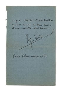VARÈSE (Edgard) Lettre autographe signée. 20 décembre 1929. 1 p. et ½ sur 1 bifeuillet in-8 (21 x 13, 1 cm), papier bleu. Lettre autographe signée du compositeur Edgard Varèse à [Arthur Hoérée], compositeur et acteur belge. «...