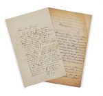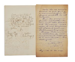 longue et complexe élaboration de La Tétralogie. Le compositeur autorise Zumpe à donner le Vaisseau fantôme à l’opéra de Salzbourg dont il est le directeur musical et l’oriente vers le cessionnaire de ses droits. Hermann Zumpe (1850-1903) est un chef d’orchestre qui aura à cœur de diffuser la musique de Wagner, parfois à l’étranger (Londres en 1898). Dans cette lettre, il est aussi question du chef d’orchestre Seidl, dans une situation financière précaire, qui « se trouve maintenant à Munich où il étudie Siegfried pour Unger » (« Jetzt ist er in München und studiert den Siegfried dem Unger ein »). L’opéra Siegfried a été achevé en 1871 par Wagner ; il sera créé le 16 août 1876 à Bayreuth dans le cadre de la première représentation du cycle complet du Ring. Transcription complète disponible. JOINT WAGNER (Cosima). Lettre autographe signée « C. Wagner ». 20 novembre 1899. 2 p. sur 1 f. in-8 (23 x 14 cm). Lettre en français de la veuve de Richard Wagner, adressée à une fidèle du festival de Bayreuth dont elle est la directrice depuis 1886. Le succès est bien établi après des débuts difficiles. « Je suis bien sensible à l’amabilité de votre envoi et aux belles paroles que vous avez consacré [sic] au théâtre de Bayreuth et je ne sais pas vous en mieux remercier qu’en vous assurant que nous avons un fond de public très sérieux, très constant et d’un enthousiasme convaincu. En 1876 nous étions si loin de ce public qu’un déficite [sic] considérable fût la suite des faits et que notre théâtre dût rester clos six années durant, de sorte qu’il y a vraiment progrès, et progrès sensible du côté du public. » Elle met sur le compte de « quelques feuilles malveillantes » les mauvais échos que sa correspondante a pu avoir. Provenance: Jean Bonna (Vente Sotheby’s, 26 avril 2017, n° 306). Bibliographie: Richard Wagner an seine Künstler, t. II, Bayreuther Briefe (1872-1883), 1908. « Brief an den königlich württembergischen Hofkapellmeister Herrn H. Zumpe », 1893, p. 76-77. 1. Petites marques de pliure. 2. Marques de pliure, importantes brunissures.