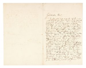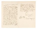 Bayreuth. Son grand projet de monter son cycle du Ring à Bayreuth, au bord de la faillite au début de l’année 1874, venait d’être renfloué in extremis par Louis II de Bavière sur ses avoirs personnels. Les répétitions d’orchestre ont commencé trois jours plus tôt, le 27 juin, à la villa Wahnfried avec l’aide de Hans Richter mentionné dans la lettre. Dans cette missive, après demande du règlement de ses honoraires où il se montre quelque peu retors, Wagner règle ses prochains cachets et le recrutement des musiciens. Le Prof. Wilhelmig et M. de Swart ne l’ont pas aidé. Mais il espère pouvoir disposer, grâce à Wilhelmig, d’excellents violonistes et violoncellistes. Transcription de la lettre sur demande. Provenance: Pierre Boulez. Traces de pliure, première phrase soulignée au crayon rouge.