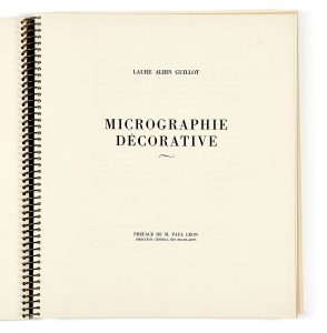 ALBIN-GUILLOT (Laure) La Micrographie décorative. Paris, Draeger frères, 1931. In-folio (43,5 x 40,5 cm), reliure à spirale, le premier plat porte le titre estampé à grandes lettres au palladium, chemise cartonnée recouverte de papier vélin et...