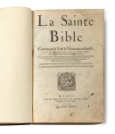doré en tête des plats, dos à nerfs orné de fleurons dorés, (reliure de l’époque). [10] ff., 420 ff. (signatures : +10, a-z8, AA-ZZ8, AAA-FFF8, GGG4). BIBLE ILLUSTREE DE FIGURES GRAVEES SUR BOIS DANS LE TEXTE. Texte sur 2 colonnes, avec la vulgate et la traduction française en vis-à-vis. Bible éditée par René Benoît, docteur en théologie, qui procède à une « réécriture » catholique de la version de Lefèvre d’Étaples et emprunte à la Bible genevoise d’Olivétan. Épître dédicatoire au roi Charles IX. Premier volume seul, comprenant l’Ancien Testament depuis la Genèse jusqu’au livre de Job. Provenance: J. Alexandre (super ex-libris doré sur les plats). Bibliographie: Chambers, Bibliography of French Bibles, n° 399. USTC, n° 5798. Un volume sur 3, dernier feuillet très lacunaire, restaurations maladroites de la reliure en tête du premier plat, aux coins et au dos, petits frottements sur la reliure, mors fendus en pied du dos, gardes renouvelées, quelques taches éparses.