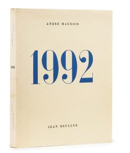 BRÜLLER.– MAUROIS (André) 1992. Deux fragments d’une histoire universelle. [Paris], Édition des portiques, 1928. Petit in-4 (25,5 x 18,8 cm), broché, couverture rempliée, étui. 106 p., [2] ff. Première édition illustrée de cette utopie,...