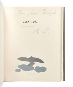 [4] ff., 1 f. bl. Édition originale. Tirage limité à 64 exemplaires, celui-ci un des 57 justifiés sur papier d’Arches (n° 54) et signés par PAB. Exemplaire enrichi, au titre, d’un envoi autographe signé au crayon de René Char à Jean Parizel, accompagné d’une gouache originale signée de PAB. Provenance: - Jean Parizel (envoi). - Pierre Boulez. Bibliographie: Cat. PAB, 1971, 426. Petite tache au plat inférieur.