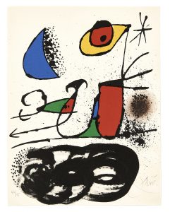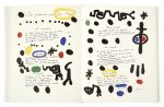 collective de textes de Char datant de 1934 à 1972 consacrés à des artistes, accompagnés de reproductions de peintures en couleurs, dessins, gravures et lithographies de nombreux artistes (Kandinsky, Ernst, V. Hugo, Picasso, Matisse, Brauner, etc.). Tirage de tête limité à 100 exemplaires sur papier vélin de Lana, celui-ci un des 75 (n° 46), accompagnés de 6 estampes originales, gravures ou lithographies, de Charbonnier, Wifredo Lam, Miró, Szenes, Vieira da Silva et Zao Wou ki, justifiées et signées par les artistes, sous couverture à part. Provenance: Pierre Boulez. Bibliographie: Monod, 2624. Petits défauts à l’emboîtage, dos passé.