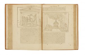 (25,3 x 18,7 cm), maroquin bouton d’or, cadre de maroquin noir et framboise avec ovale entouré de petits cercles collé au premier plat, dos à nerfs avec pièces de titre en maroquin framboise et d’auteur en veau vert foncé, doublures avec encadrement de maroquin bouton d’or et gardes de veau noir avec encadrement de veau framboise et titre doré dans un cadre doré (reliure du XXe siècle). [19] ff. avec le frontispice, 154 ff., [6] ff. ÉDITION ILLUSTREE D’UN FRONTISPICE GRAVE EN TAILLE-DOUCE ET DE 181 GRAVURES SUR BOIS EXECUTEES D’APRES LES DESSINS DE JEAN COUSIN POUR L’EDITION DE 1546, A L’EXCEPTION DE TROIS D’ENTRE ELLES, QUI ONT ETE REGRAVEES POUR L’OCCASION. Édition avec le titre à la date de 1600 de la traduction de Béroalde de Verville, adaptée de celle de Jean Martin en 1546. Il y eut trois éditions cette même année dont la primeur n’est pas claire. La préface propose une interprétation alchimique de l’œuvre de Colonna. Les bois des p. 68 (« Sacrifice à Priape ») et 120 (« Ithyphalle ») n’ont pas été mutilés. Bibliographie: Tchemerzine, II, 198 (avec des erreurs). Brun, Le livre illustré en France au XVIe s., p. 157. Feuillet blanc à la fin de la préface en déficit, petit manque de papier en pied du frontispice et en tête du f. 65, gardes anciennes consolidées, des rousseurs, tache en pied du f. 49, piqûres au dernier f., nombreux cahiers brunis, nombreuses galeries de ver, réfections de papier en marge de la préface et réfection angulaire au premier f. de la table, quelques frottements au dos.
