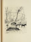 épis de blé et pampres, encadrement intérieur de même maroquin avec un filet doré, doublures et gardes de peau velours vert jaune, tranches dorées, couvertures et dos conservés, chemises et étui (Georges Cretté). I. 4 ff. blancs, 204 p., 3 ff. blancs ; II. 2 ff. blancs, 216 p., [6] ff., dont 3 blancs (les figures sont comptées dans la pagination). Texte latin en regard de la traduction française par Michel de Marolles. ÉDITION ORNEE DE 119 EAUX-FORTES ORIGINALES D’ANDRE DUNOYER DE SEGONZAC, DONT 99 A PLEINE PAGE. « Premier tirage du plus important des livres illustrés de Dunoyer de Segonzac. “J’ai gravé toutes les planches des Géorgiques devant le merveilleux spectacle du terroir, aucune n’a été gravée à l’atelier […]” » (Monod). Tirage limité à 250 exemplaires numérotés sur papier vélin d’Arches ; l’un des 25 exemplaires d’auteur (n° V), ici accompagné d’une suite complète des eaux-fortes. Elle est reliée en un volume in-folio, maroquin vert pin janséniste, doublures et gardes de peau velours de même ton, tranches dorées. Plaisant exemplaire très bien établi par Georges Cretté, dans une reliure parlante. Bibliographie: Monod, n° 11340. The Artist & the Book, 1860-1960, n° 281, p. 189. Lioré, Cailler, Catalogue de l’œuvre gravé de Dunoyer de Segonzac, V, 1965, n° 863-981. Chapon, Le Peintre te le livre, p. 164. Garrigou, les Maîtres de la reliure. Georges Cretté, n° 623 (reliure non reproduite dans cette monographie, mais dans un article de Jacques Guignard). Quelques légères rousseurs et décharges des figures. Dos des chemises assombris, étuis un peu frottés.