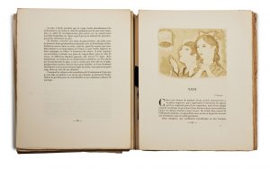 EAUX-FORTES ORIGINALES EN COULEURS ET EN DEUX TONS DE FOUJITA (DONT LE FRONTISPICE). Tirage à 458 exemplaires, celui-ci est un des 75 sur papier vélin (en réalité vergé) de Hollande contenant deux états des eaux-fortes (n° 81). Bibliographie: Talvart et Place XII, 269. Carteret, Illustrés, IV, 247. Bords des ff. brunis, quelques décharges ou brunissures partielles des ff. ; couverture brunie, déchirures en tête et queue du dos de celle-ci. Étui usagé.